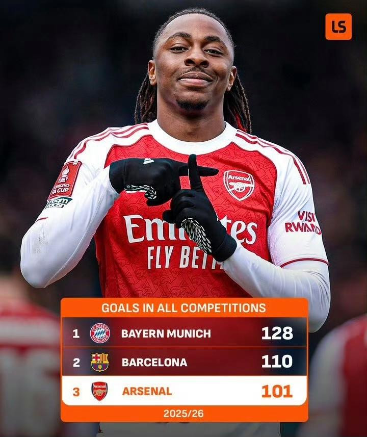 当诺尼·马杜埃凯的射门在曼斯菲尔德的主场应声入彀时,这粒进球不仅匡助阿森纳在足总杯中获取最初,更镌现时了一个极具重量的里程碑。阿森纳成为本赛季英格兰第一支、欧洲五大联赛第三支各项赛事进球破百的球队 。