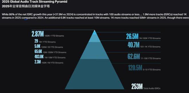 同期,多数音乐事实上从未被听见。证据Luminate年终通晓数据骄横,尽管2025年净新增的ISRC(国际圭臬音像成品编码)相较2024年增长3790万首,其中86%的新增曲目播放量都濒临在年播放≤100次的层级,约88%的曲目年播放量在1000次或以下(够不上Spotify取得版税的最低门槛)。