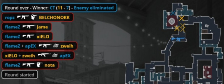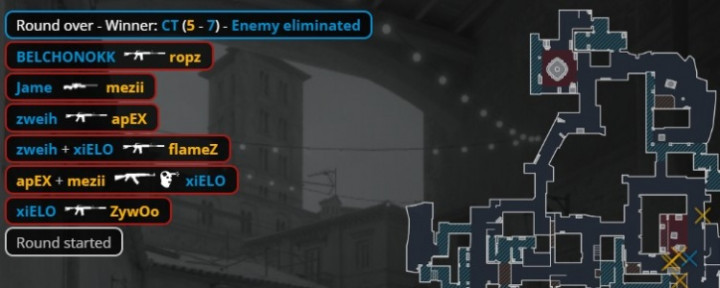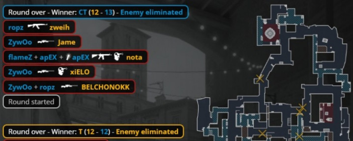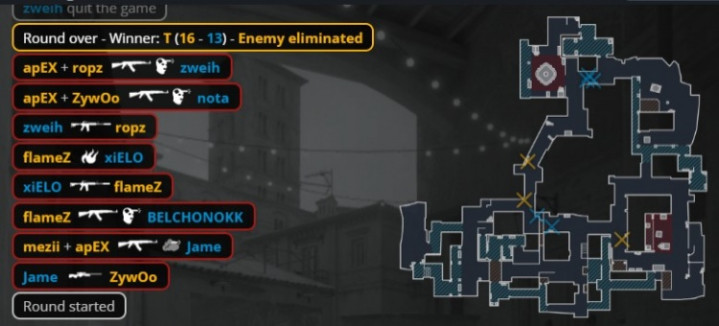 加时赛首回合,Zywoo大狙A二楼上轰掉KK,随后回到A链接再轰xiELO与天主,小蜜蜂13-12PV。