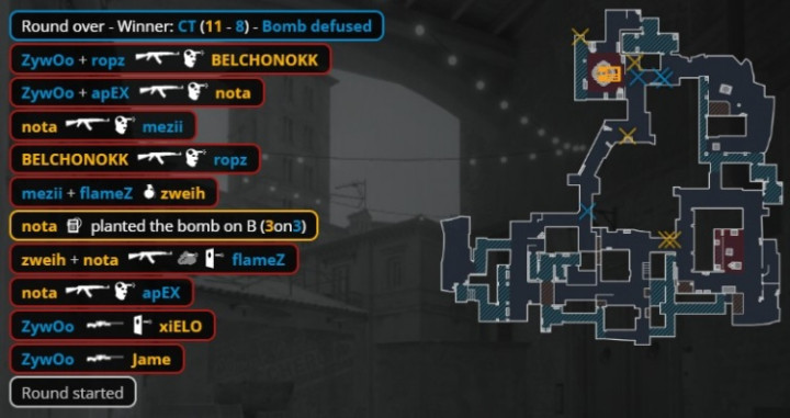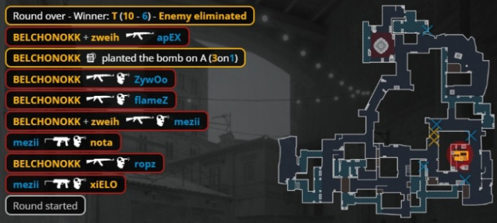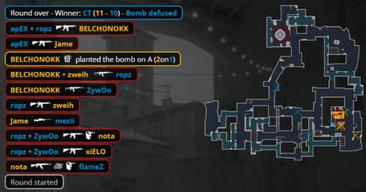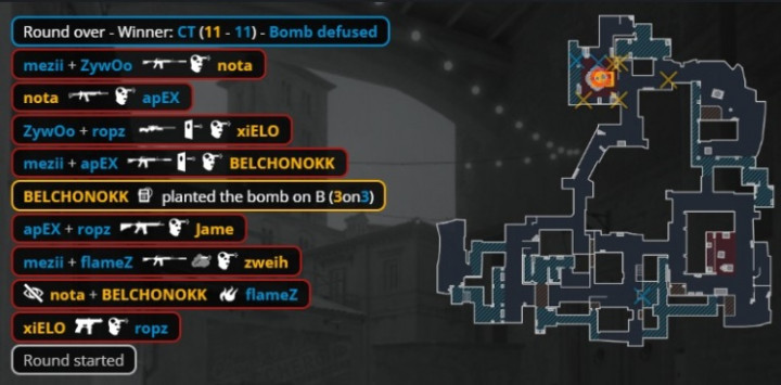 第10回合小蜜蜂纯E让出第6分。第11回合蛇矛局,KK在A链接凹槽换掉火仔,Zywoo独自出警家换掉nota,xiELO断警家双杀被mezii打掉,mezii带包来B下包拿到第5分。
