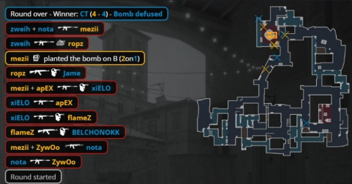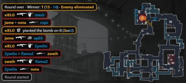 加时赛第3回合,KK与xiELO用tec-9,PV三把AK四东谈主来B,Zywoo死点双杀nota与zweih,xiELO手撕Zywoo后在B下包,天主混烟带走apex大狙轰掉ropz,小蜜蜂14-13PV。