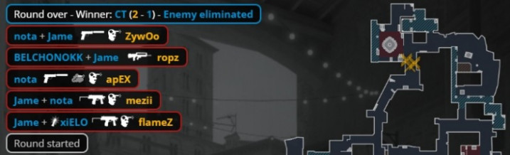 加时赛第2回合,Zywoo大狙再来A二楼近点前顶先杀KK,A链接mezii换掉xiELO,zweih打掉apex,残局3v3,火仔在B一箱上直架教堂打掉zweih,天主被ropz偷掉,nota残局1v3无力回天,小蜜蜂14-12PV。