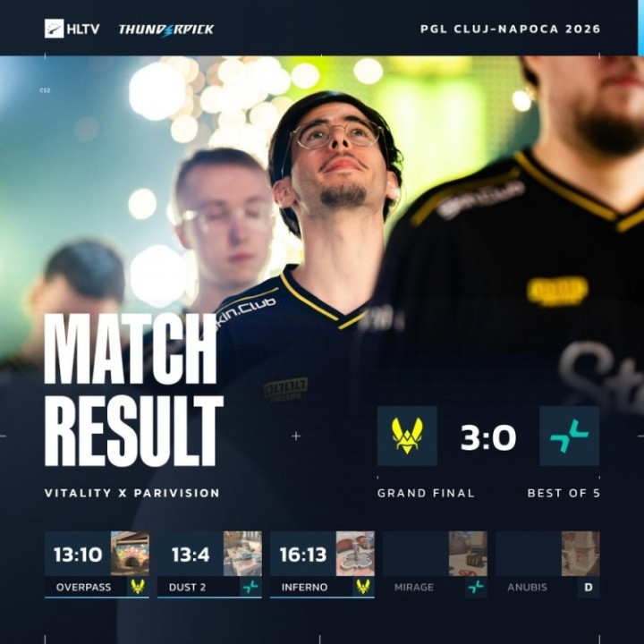 加时赛第5回合,天主大狙先杀Zywoo,但香蕉谈mezii与火仔双杀KK与天主,正面2v2,C4掉在匪口,apex打掉nota后再杀zweih,小蜜蜂16-13三图横扫PV,勇夺PGL冠军!