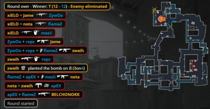 第24回合PV五东谈主冲B区,apex换掉KK,zweih在B下包,zweih在B下包,天主与Zweih双东谈主站在死点被Zywoo击杀,xiELO残局1v3爆轰三杀,两边12-12插足加时!