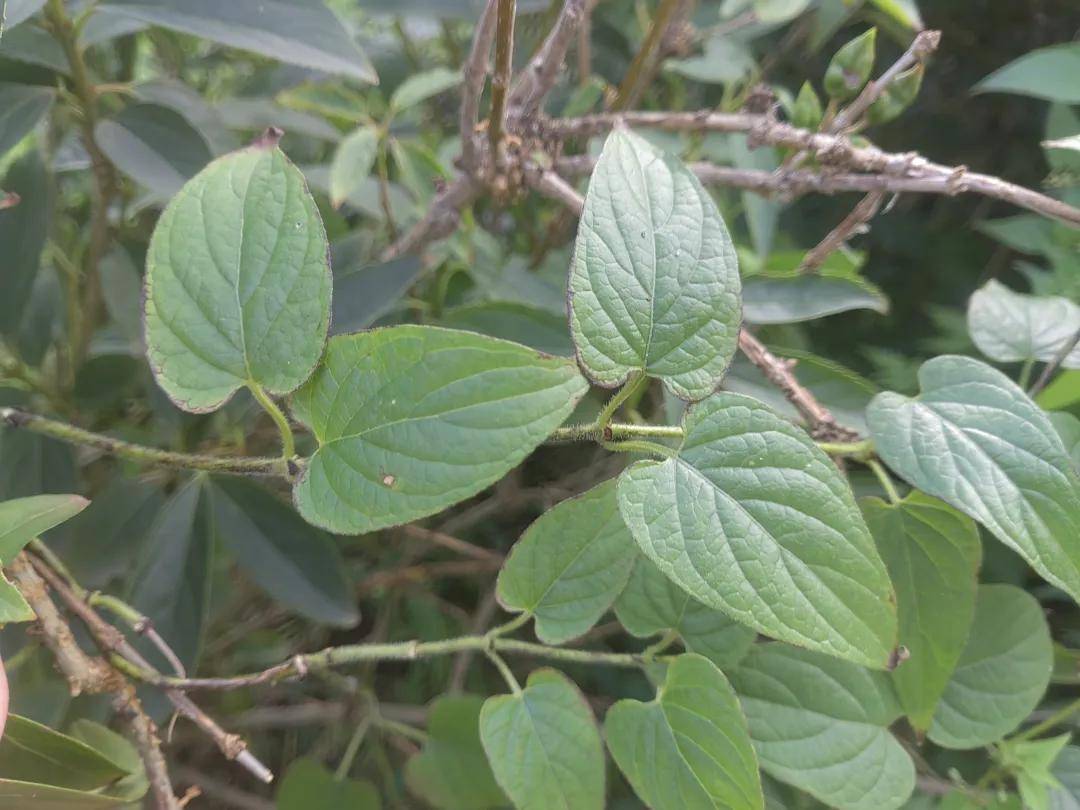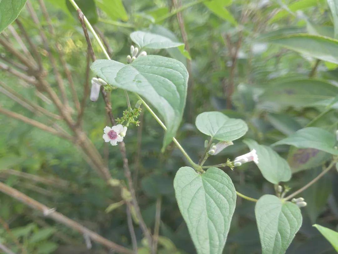 它的叶子对生,方法为椭圆形、卵状长圆形、披针形等。我见到的这些,嗅觉越往上,叶子越小,也越瘦。基部心形,藤蔓绿色。