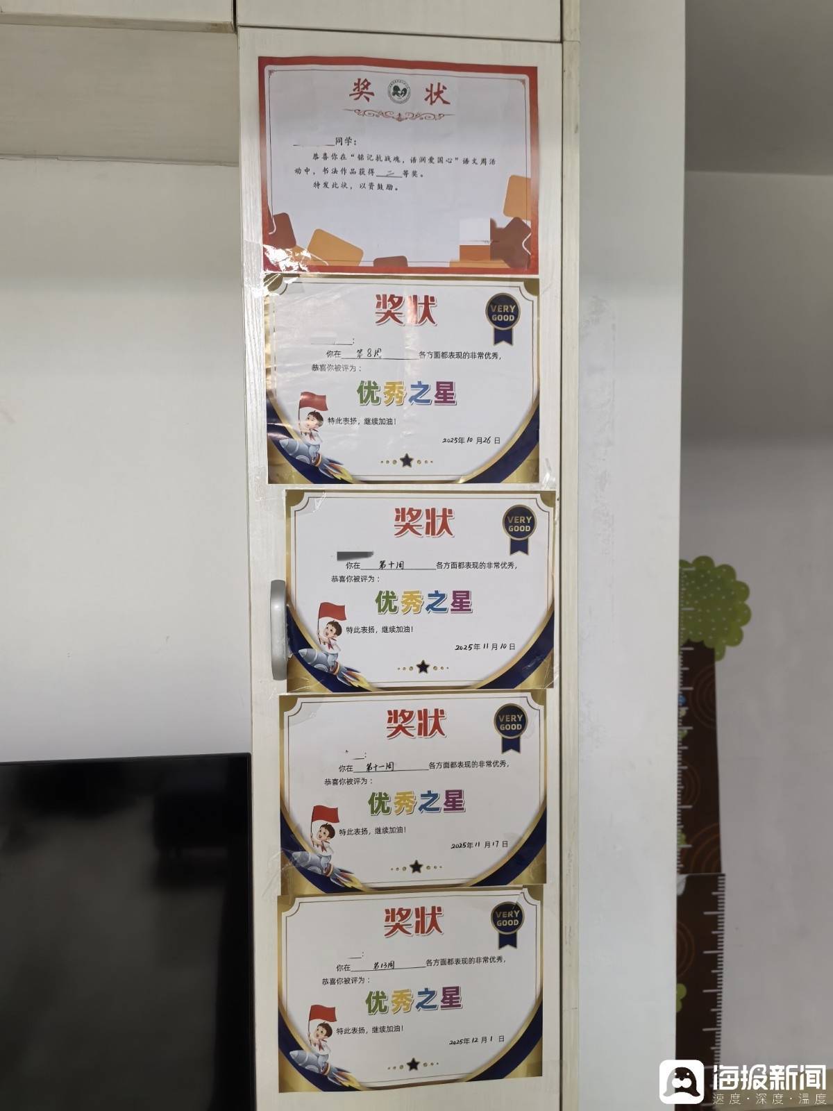 1月10日,星期六,危一家所在的小区里比平时要打扰许多。上昼9点阁下,记者敲开了危一的家门。这是一处约70广泛米的两居室,危一配偶带着3岁的男儿住一间,佳佳和姥姥住另一间。客厅略显局促,摆放着一张四东说念主沙发和一张茶几。最显眼的,是贴满墙壁的奖状——这些都是佳佳在学校得的。