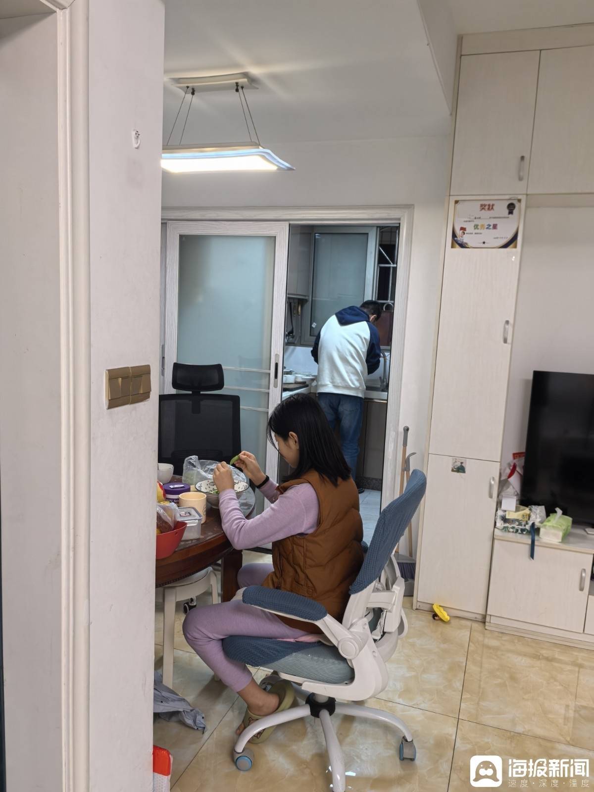 中午12点,危一在厨房里作念饭,太太在一边照料3岁的男儿,佳佳主动赞理择菜,整个房子里暖洋洋的。