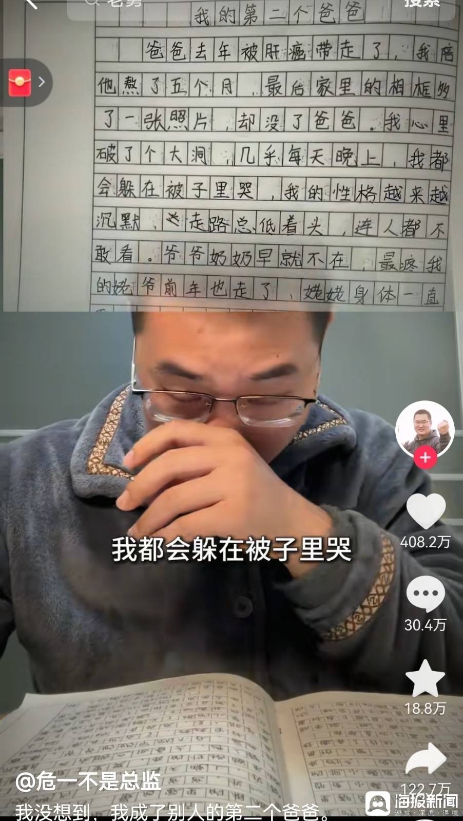 12岁山东女孩佳佳的一篇作文《我的第二个爸爸》全网出圈,视频点赞量跳跃400万。