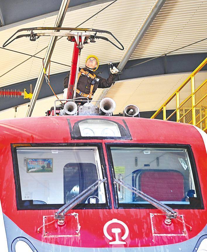 1月17日,武昌南机务段的责任主谈主员正在机车顶棚上检会机车。 (湖北日报全媒记者 朱熙勇 通信员 唐珂欣 摄)