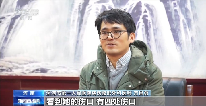 漯河市第一东说念主民病院烧伤整形外科医生 万昌勇:看到她有四处伤口,最长的便是左侧的下颌缘,一直到骨头了,下颌这个方位就到颈阔肌,可能再砍伤2毫米就到咱们的面动脉了。
