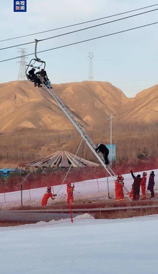 网友发布的视频中,旅客坐在缆车上停在半空。缆车下方有转圜东说念主员正在施救。转圜东说念主员示知旅客将雪板沿路扔下后,在缆车座位下方搭长梯将旅客救出。