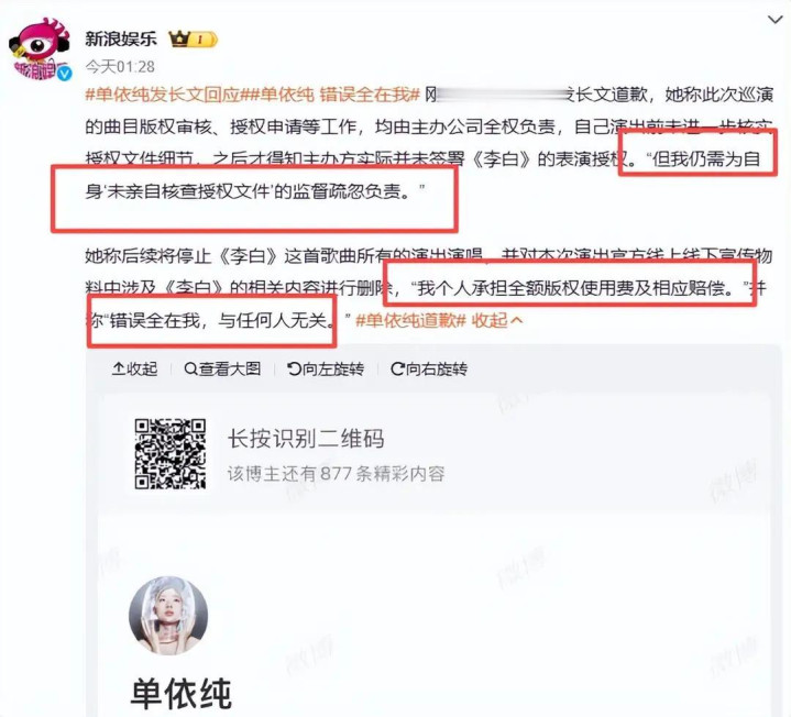 次日凌晨,单依纯再发长文把包袱都揽到了我方身上,她暗示说把授权交给了专揽方,我方没核实,承诺住手演唱《李白》,删除有关物料,况且承担全部的补偿。
